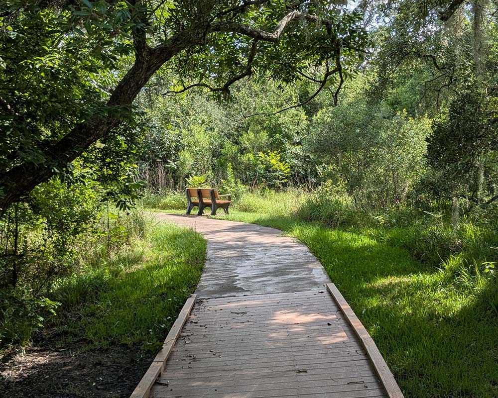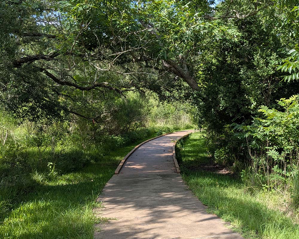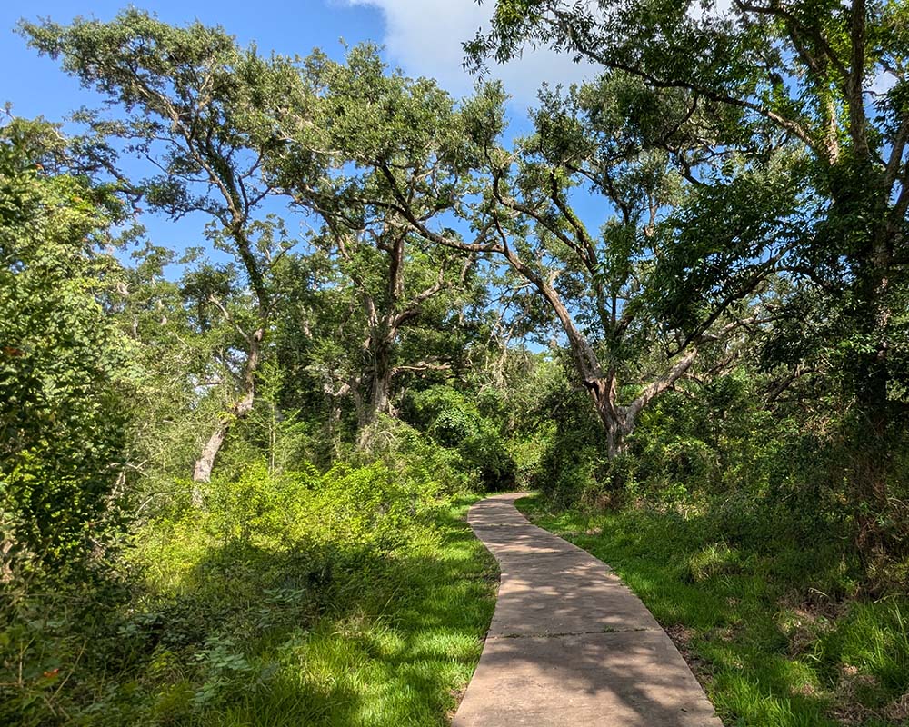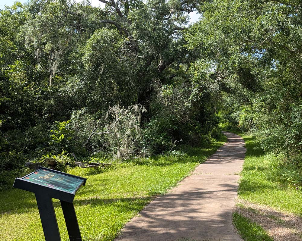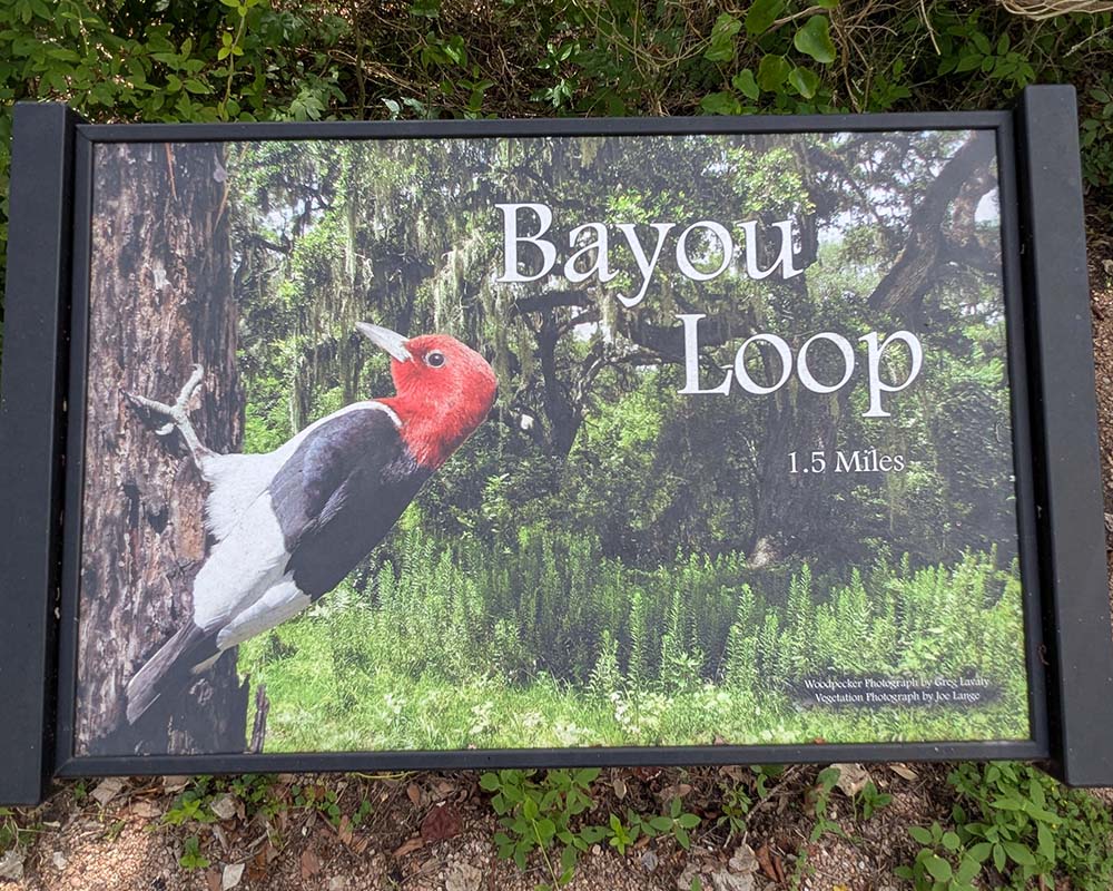 There are two main trails here, both short, both worth walking. The Bayou Loop Trail is about a mile and a half of packed gravel that hugs the upper edge of the bayou. It’s a good stretch if you’re looking to catch birds in the brush or maybe spot a deer cutting through the trees.